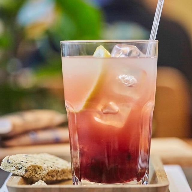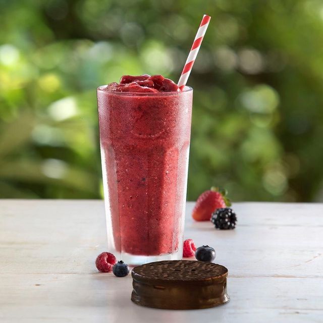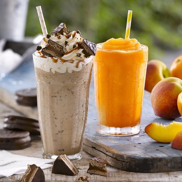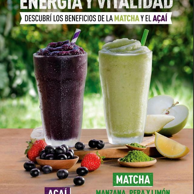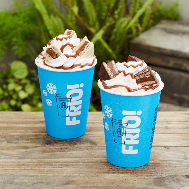 Combinación helada de dulce de leche y leche, espresso, cubierto con crema batida, salsa de dulce de leche y pedacitos de alfajor de nuez.