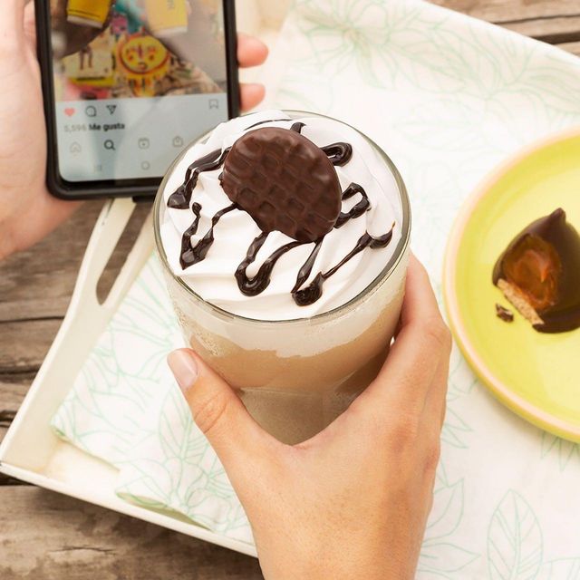 combinación helada de crema de chocolate havanna, espresso y leche, cubierto de crema batida, salsa de chocolate y medallón.